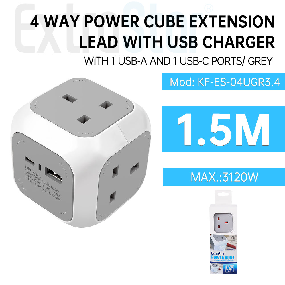 4 Way Power Cube Extension Lead with Dual USB Ports, 1.5m, Grey (KF-ES-04UGR3.4 )